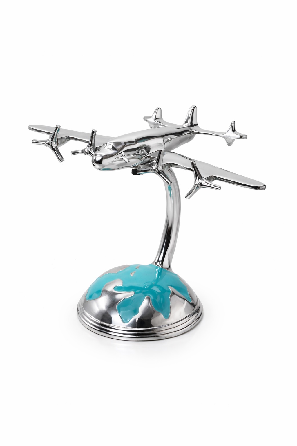 Celebrate the spirit of travel and discovery with Tour the World, a stunning fusion of art, craftsmanship, and aviation heritage. This captivating piece features a hand cast airplane in flight above a polished aluminium globe, symbolising the boundless possibilities of exploration and human ingenuity.